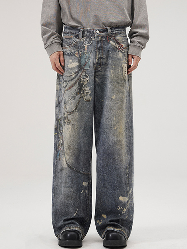 Vaqueros holgados con estampado de grafiti y empalme desgastados de calle para hombre