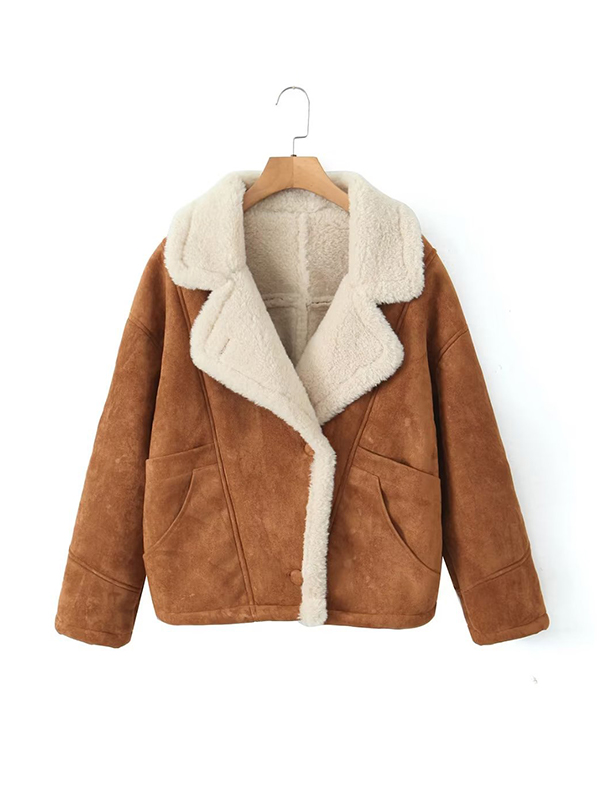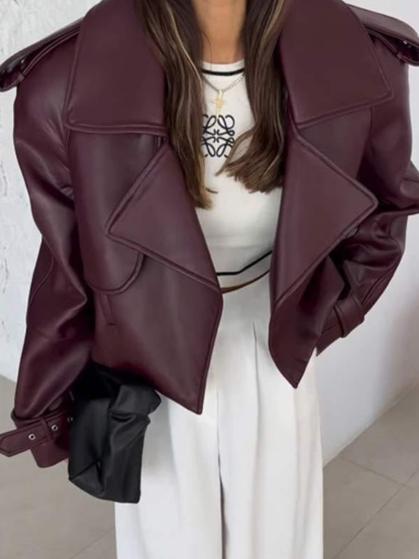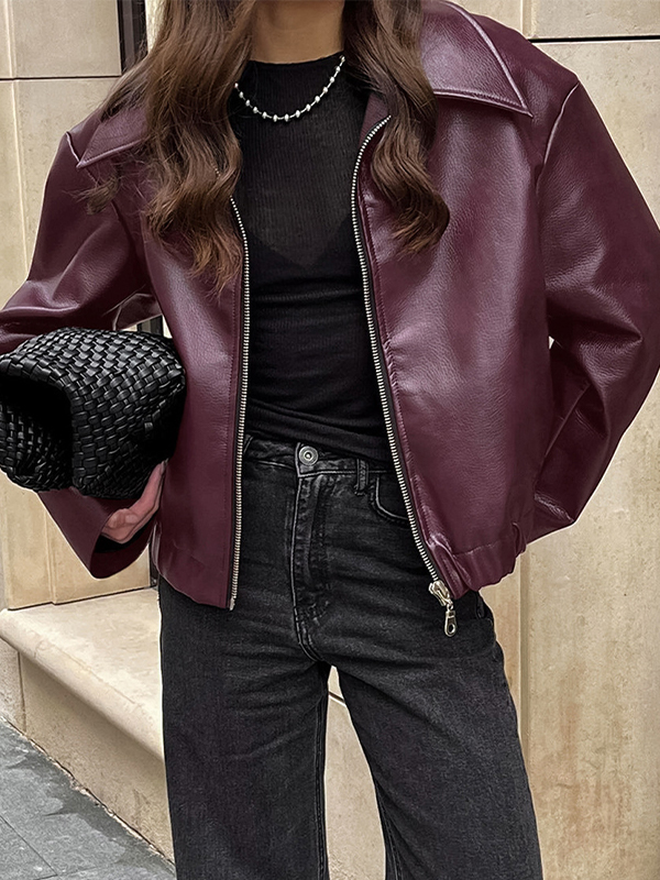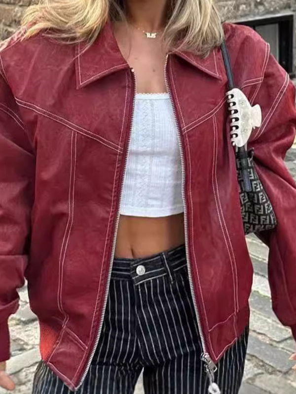Chaqueta de cuero con parches y cuello de piel estilo americano